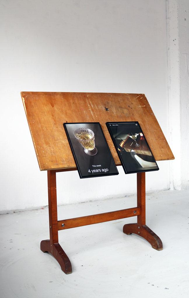. Framed digital prints, drafting table. 40 x 50 x 16 in.